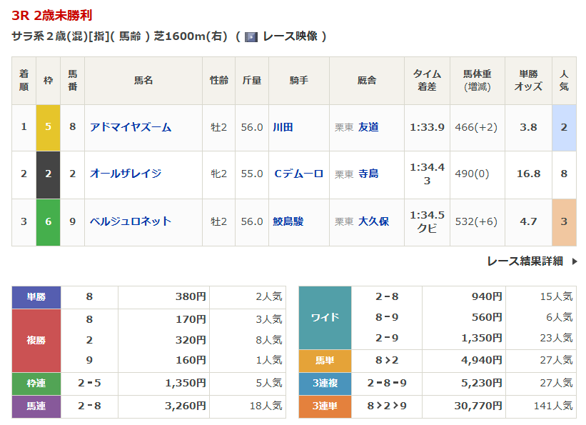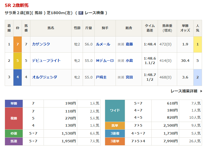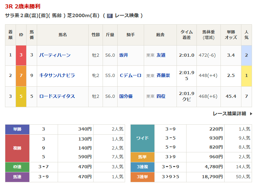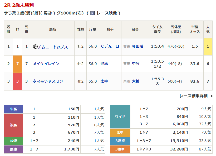 ◎カンレイスキー(9人気)1着 単勝1,950円、複勝710円 - 11/3【東京3R】2歳未勝利