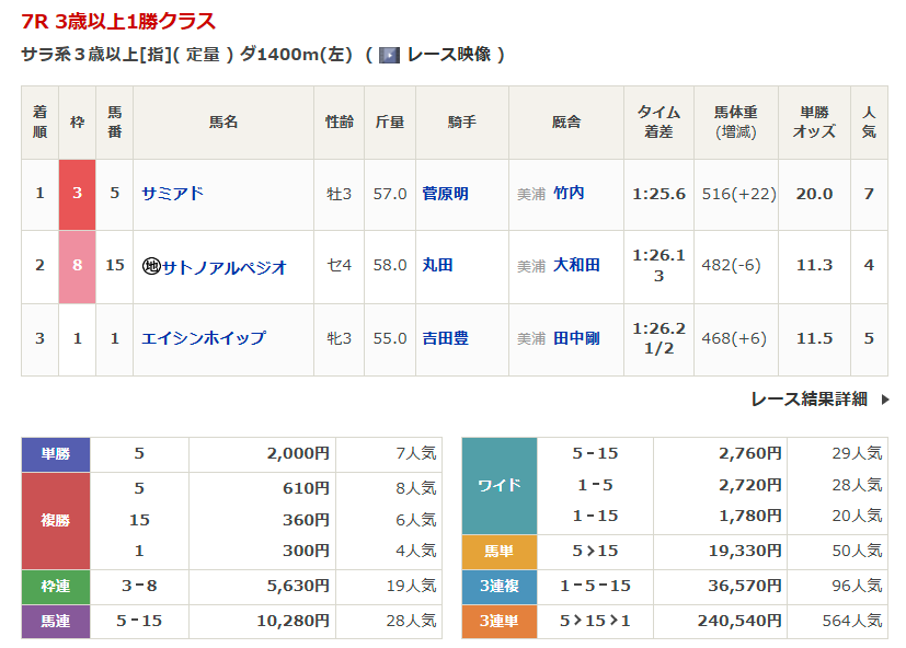 ◎ピリカサンライズ(7人気)1着 単勝1,000円、複勝310円