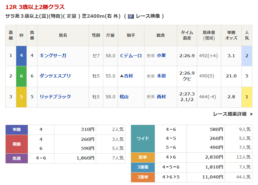 ◎キングサーガ(2人気)1着 単勝310円、複勝260円