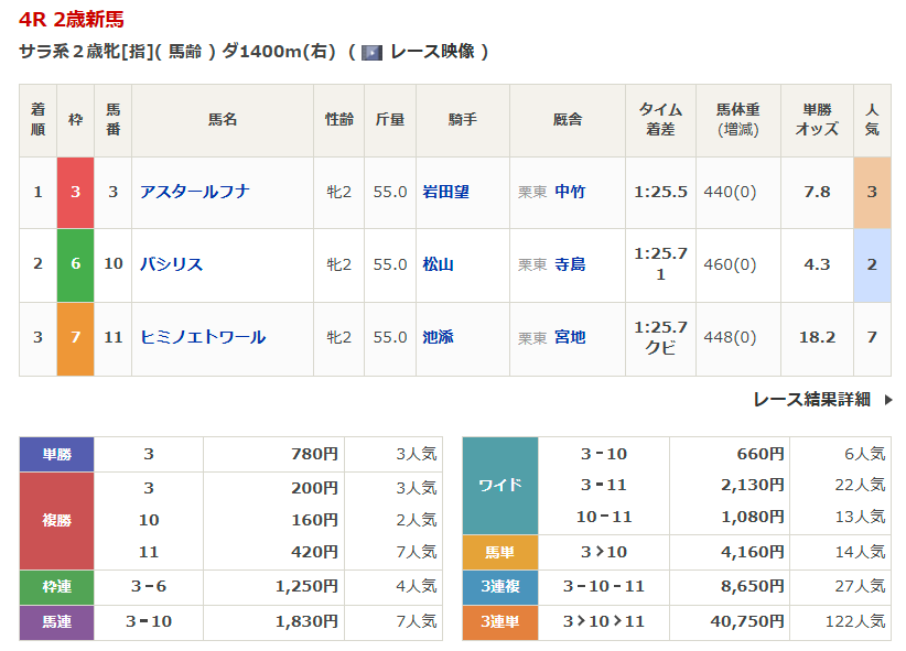 ◎アスタールフナ(3人気)1着 単勝780円、複勝200円