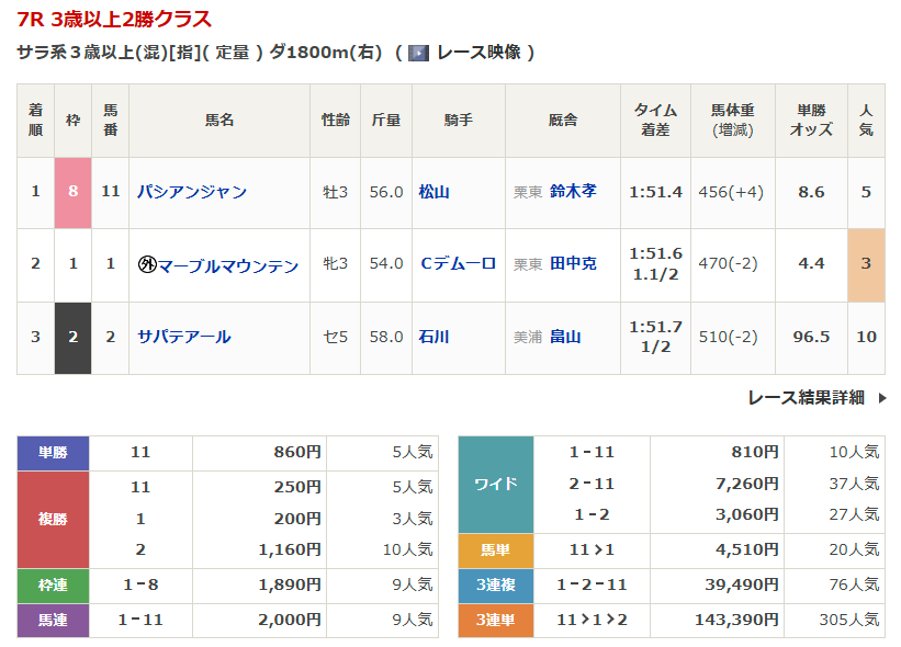 ◎パシアンジャン(5人気)1着 単勝860円、複勝250円