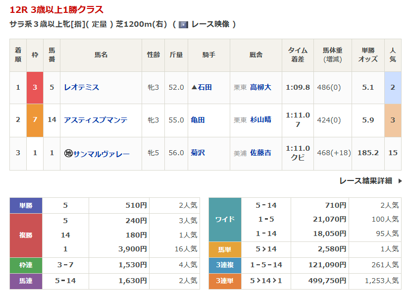 ◎レオテミス(2人気)1着 単勝510円、複勝240円