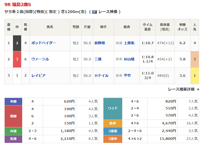 ◎ポッドベイダー(4人気)1着 単勝620円、複勝190円