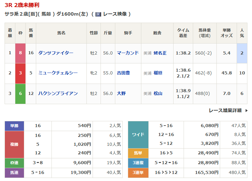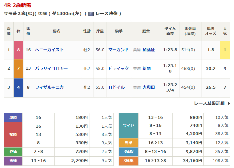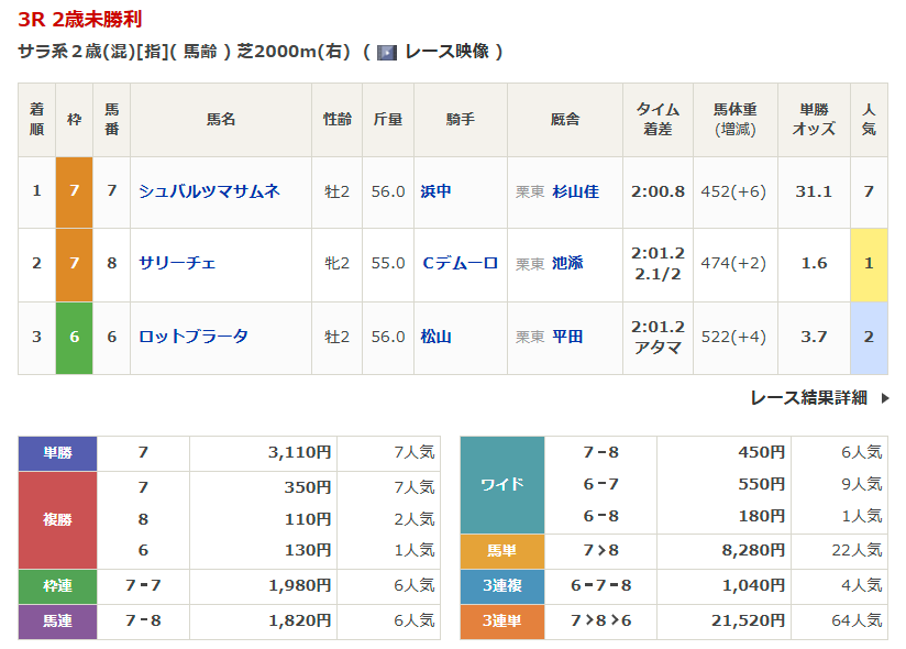 ◎シュバルツマサムネ(7人気)1着 単勝3,110円、複勝350円 - 11/23【京都6R】2歳新馬