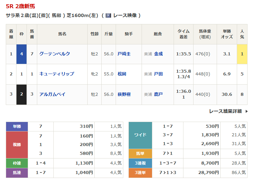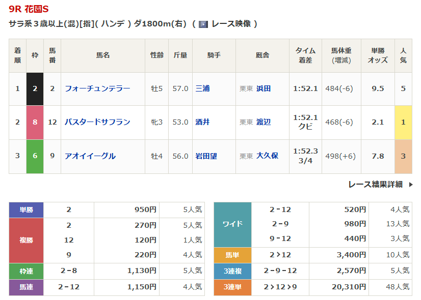 ◎フォーチュンテラー(5人気)1着 単勝950円、複勝270円