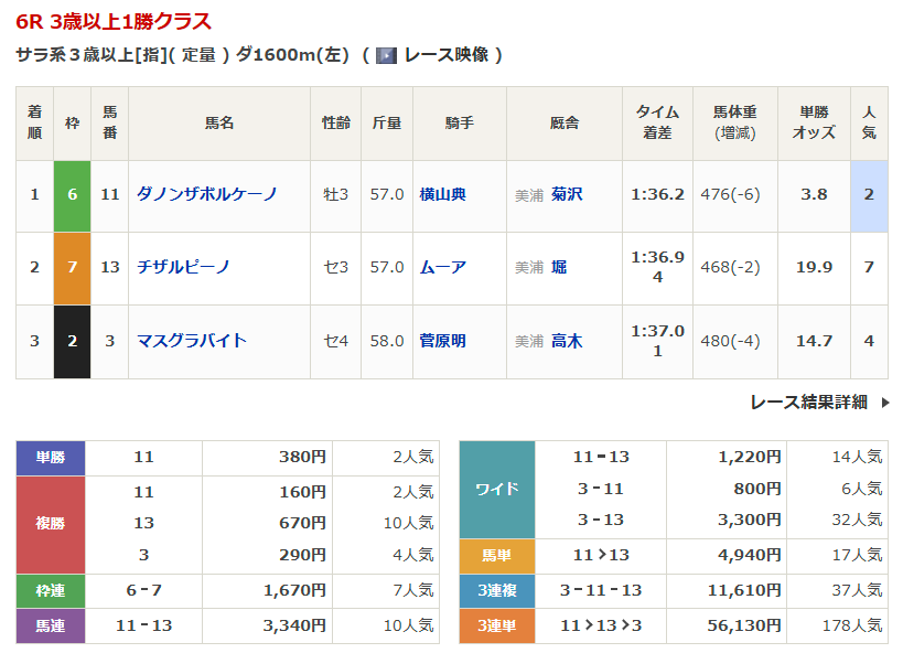 ◎シュバルツマサムネ(7人気)1着 単勝3,110円、複勝350円