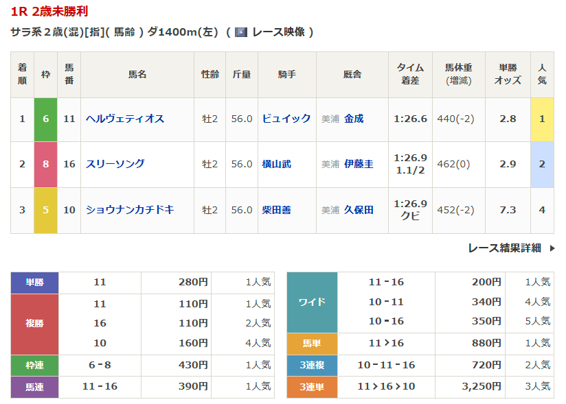 ◎ヴェサリウス(4人気)1着 単勝720円、複勝290円 - 11/17【京都3R】2歳未勝利