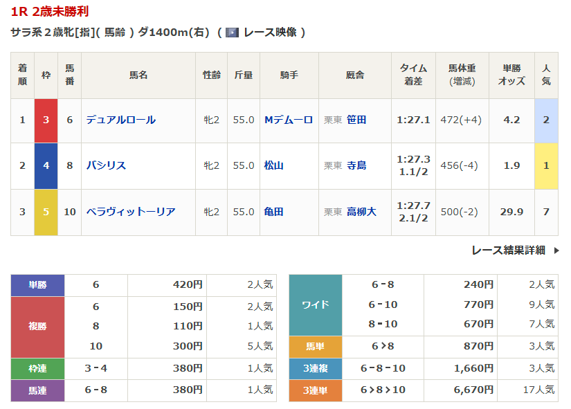◎ハクサンバード(6人気)1着 単勝1,370円、複勝290円 - 11/3【京都4R】2歳新馬