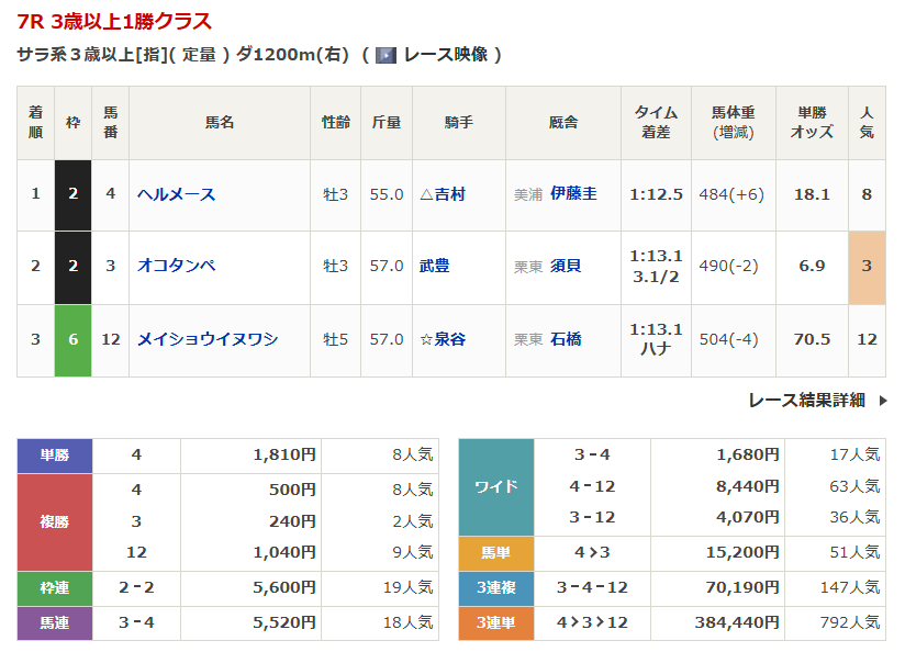 ◎メイショウイヌワシ(12人気)3着 複勝1,040円