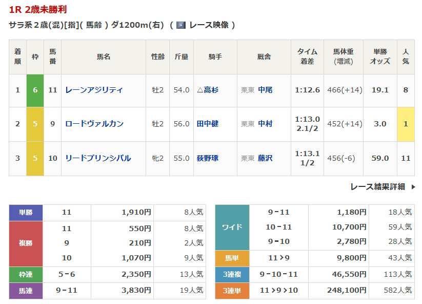 ◎レーンアジリティ(8人気)1着 単勝1,910円、複勝550円