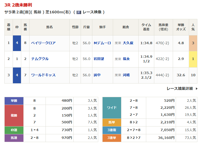 ◎シームルグ(2人気)3着 複勝170円 - 11/16【京都6R】2歳新馬