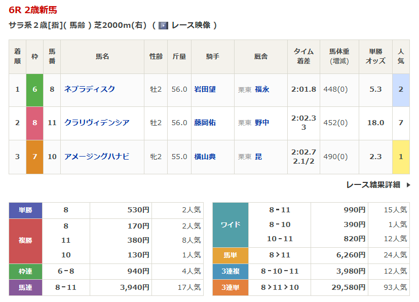 ◎ヴァイスクレー(6人気)2着 複勝330円 - 11/2【東京5R】2歳新馬