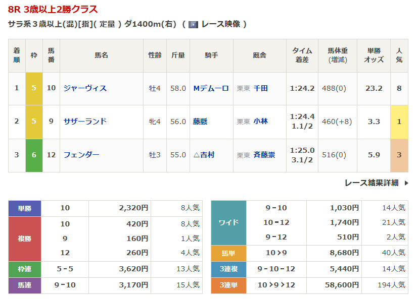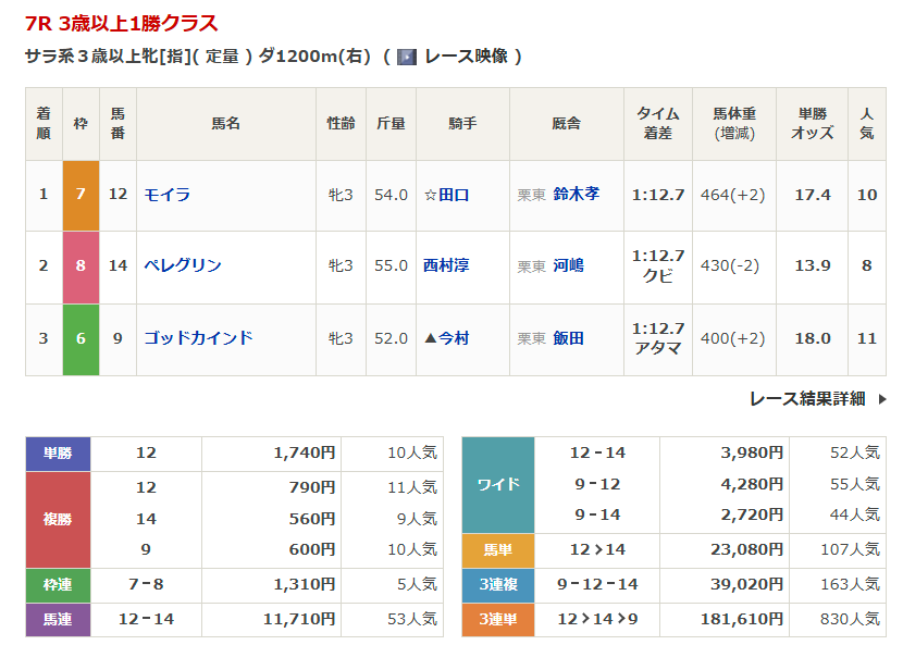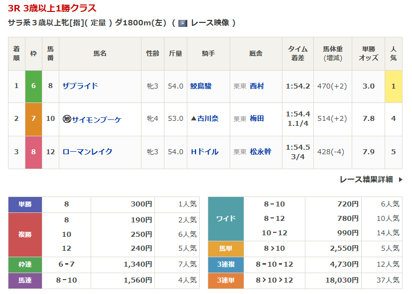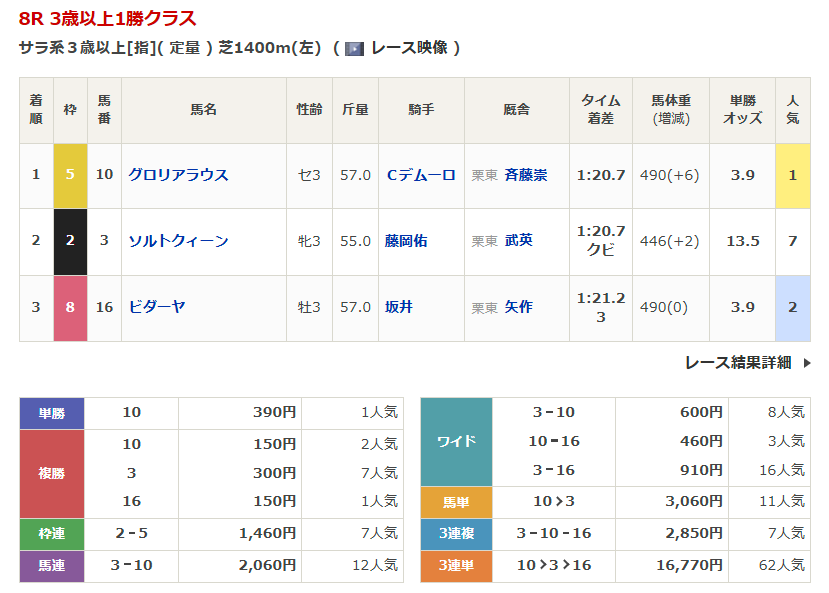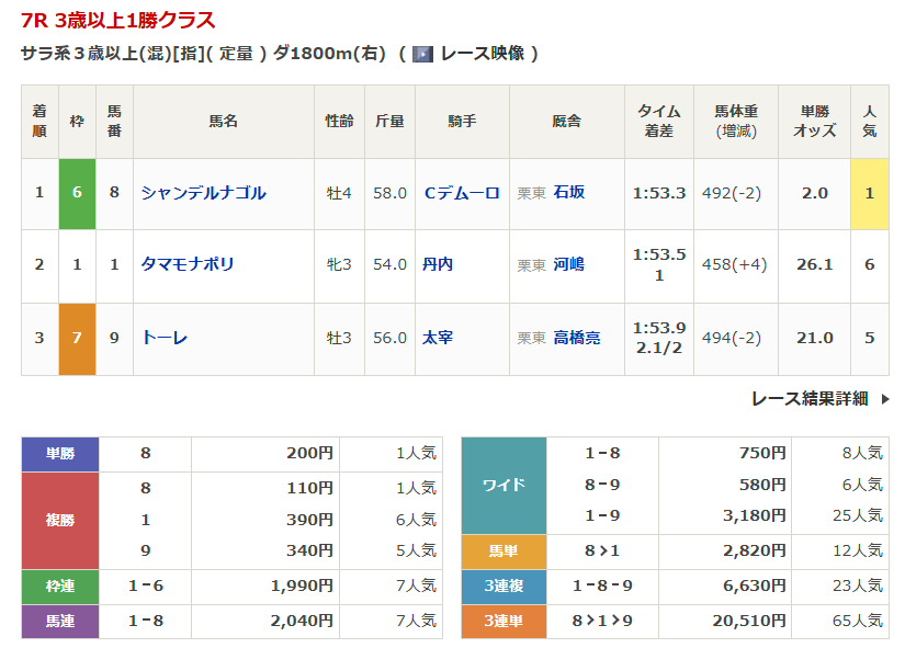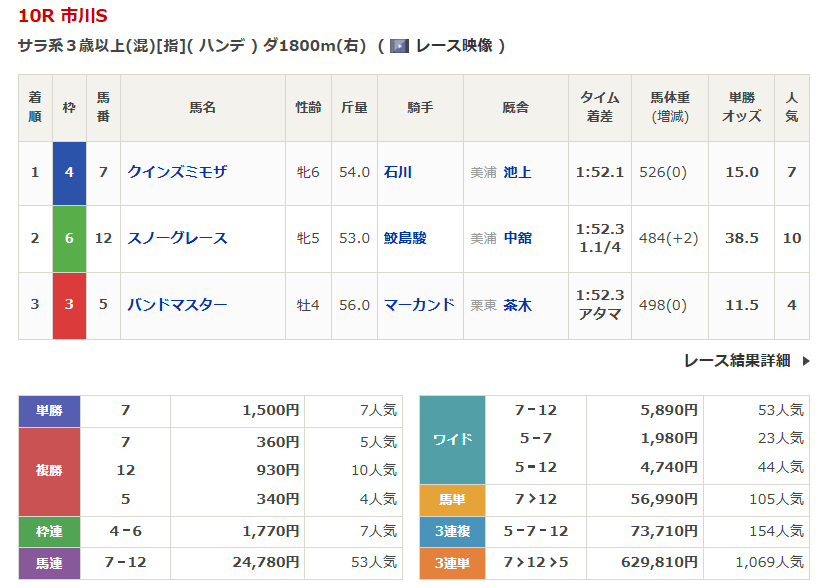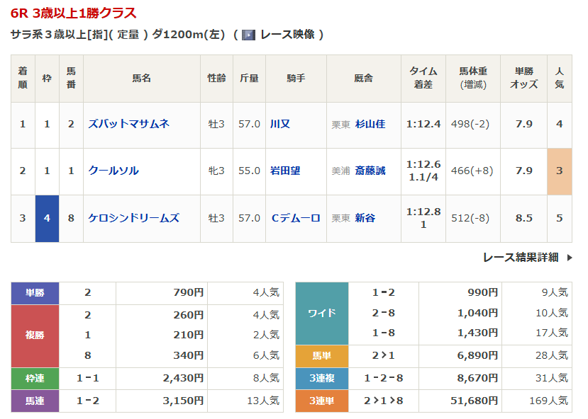 ◎ズバットマサムネ(4人気)1着 単勝790円、複勝260円