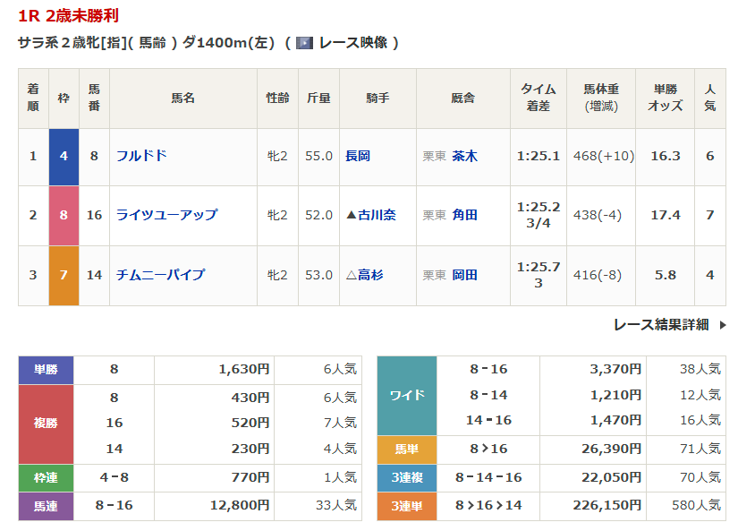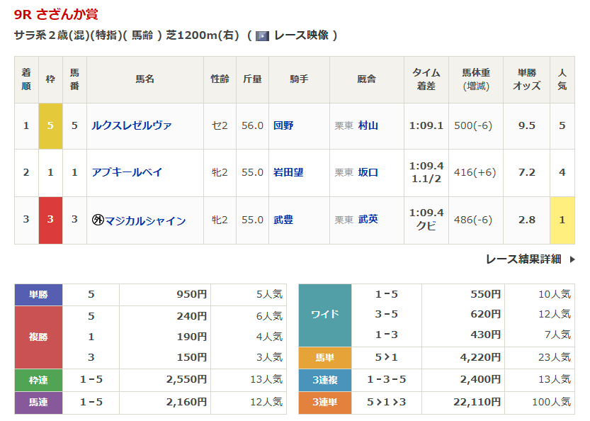 ◎ルクスレゼルヴァ(5人気)1着 単勝950円、複勝240円