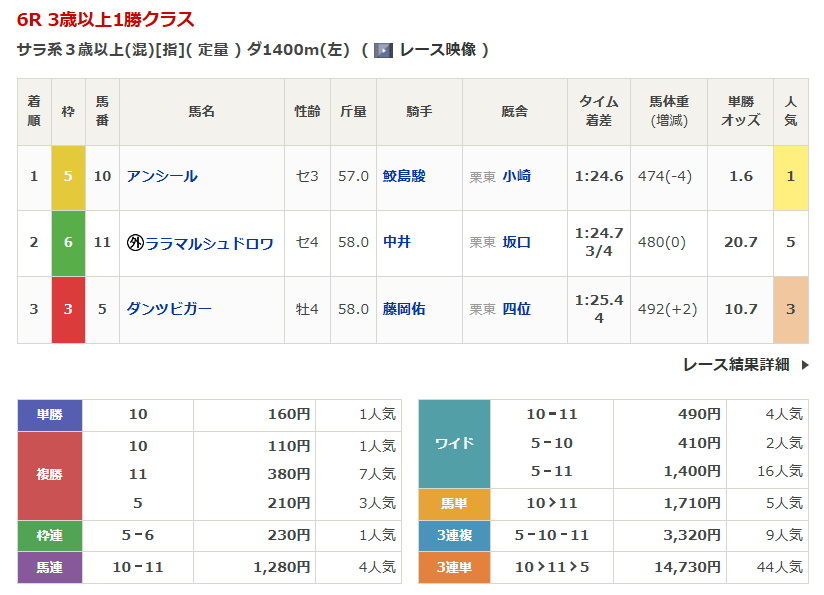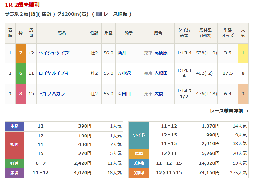 ◎パシアンジャン(5人気)1着 単勝860円、複勝250円