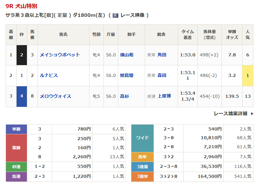 ◎メイショウイヌワシ(12人気)3着 複勝1,040円 - 11/23【京都8R】3歳以上1勝クラス