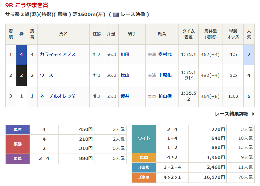 ◎キアヌ(3人気)1着 単勝430円、複勝170円 - 11/2【東京4R】2歳未勝利