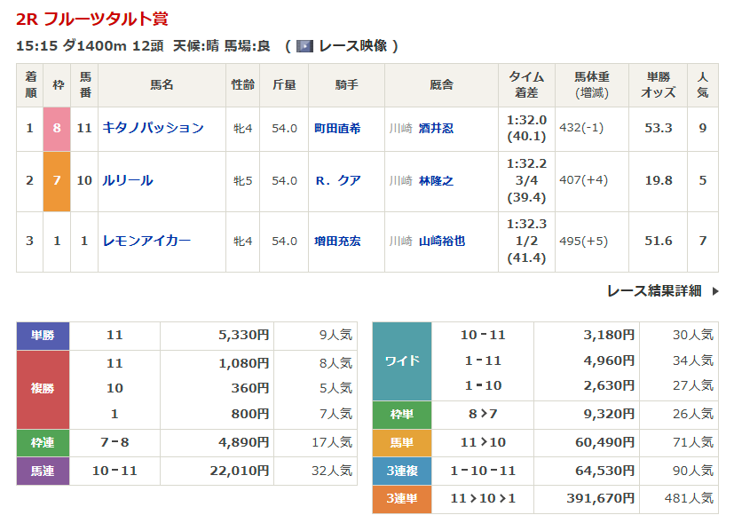◎キタノパッション(9人気)1着 単勝5,330円、複勝1,080円