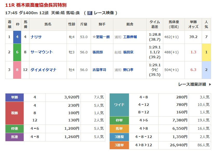 ◎ナリサ(7人気)1着 単勝3,920円、複勝230円 - 11/18【浦和12R】栃木県馬事畜産振興協議会長賞特別