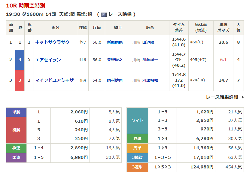 ◎キットサクラサク(8人気)1着 単勝2,060円、複勝610円 - 11/12【川崎11R】ローレル賞