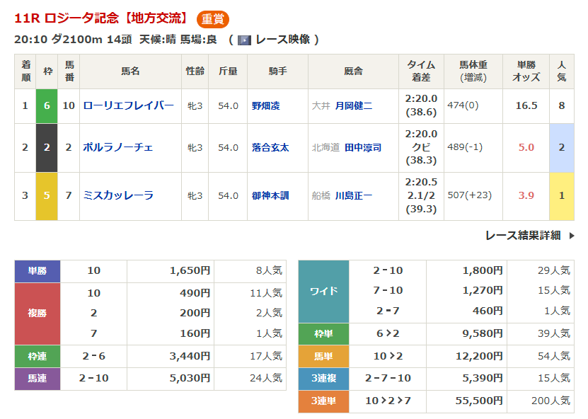 このレースでは◎ローリエフレイバー(8番人気)が1着に好走。相手馬の★ポルラノーチェ(2番人気)2着、★ミスカッレーラ(1番人気)3着を押さえて3連単は55,500円の配当となりました。