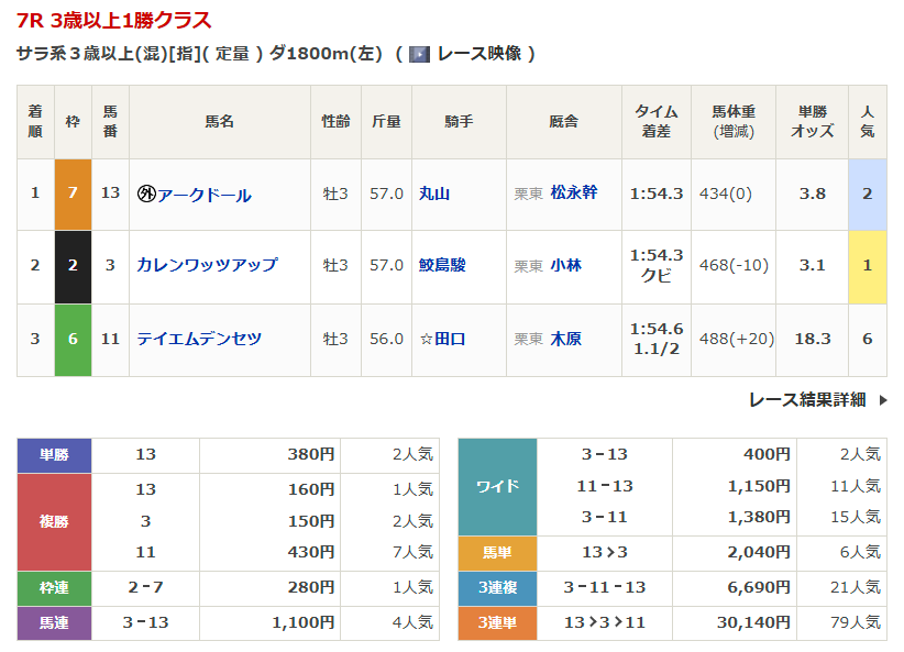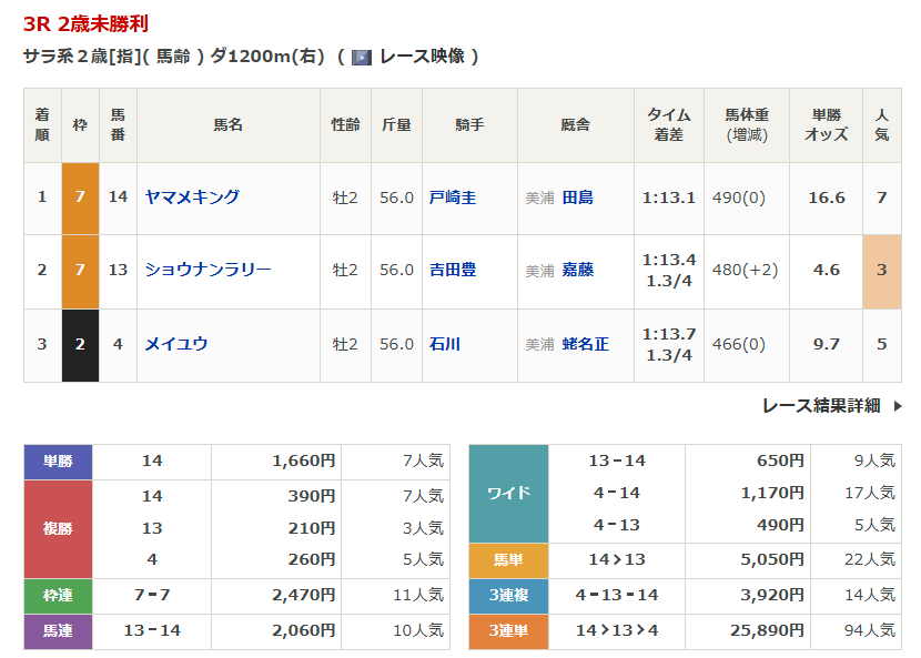 ◎ヤマメキング(7人気)1着 単勝1,660円、複勝390円
