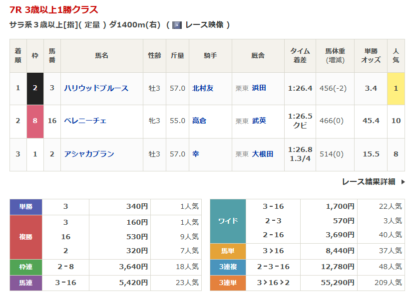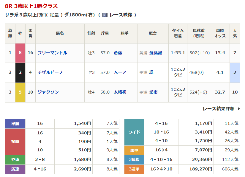 ◎フリーマントル(7人気)1着 単勝1,540円、複勝340円