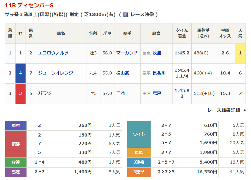 ◎ジューンオレンジ(6人気)2着 複勝270円 - 12/15【中山12R】3歳以上1勝クラス