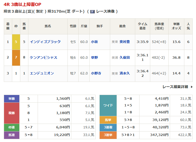 ◎インディゴブラック(6人気)1着 単勝1,560円、複勝630円