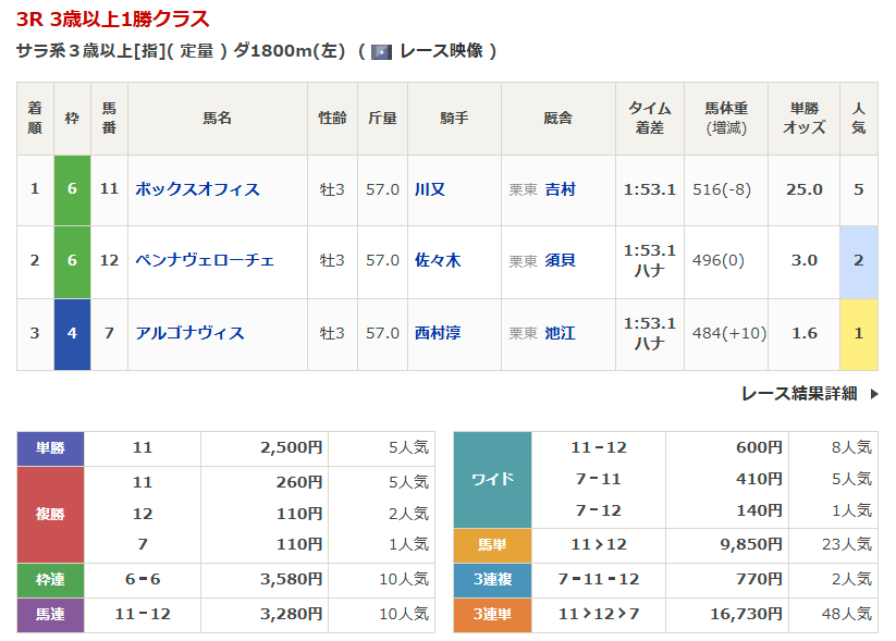 ◎ボックスオフィス(5人気)1着 単勝2,500円、複勝260円
