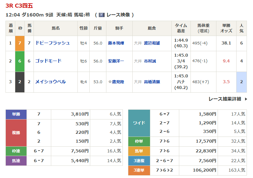 ◎ドビーフラッシュ(6人気)1着 単勝3,810円、複勝530円