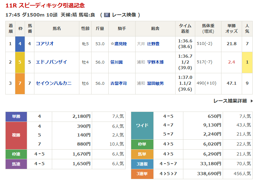 ◎コアリオ(7人気)1着 単勝2,180円、複勝390円