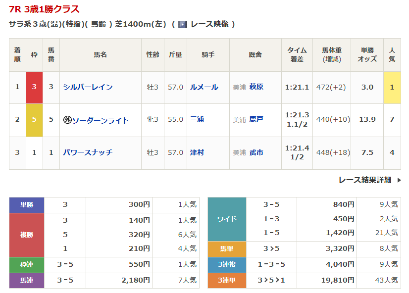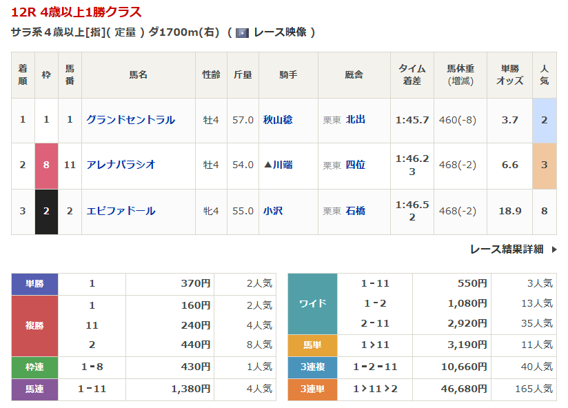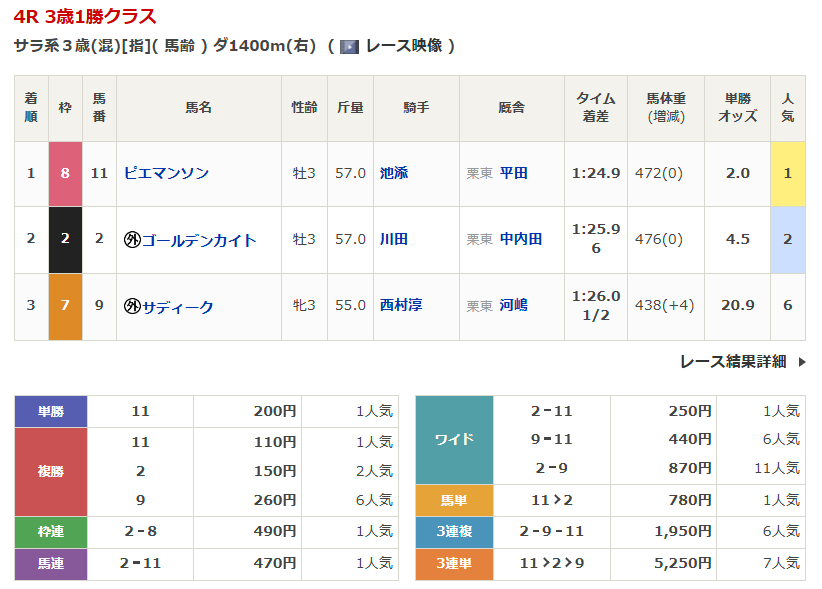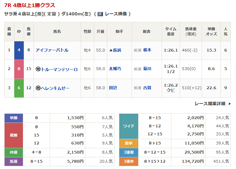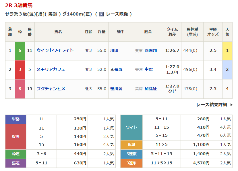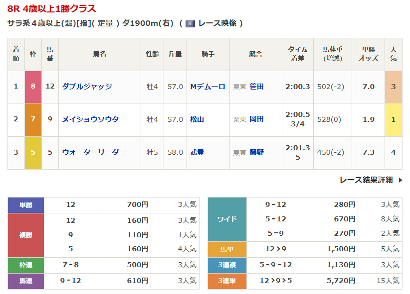 ◎ダブルジャッジ(3人気)1着 単勝700円、複勝160円