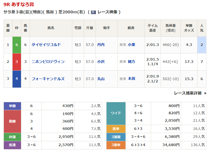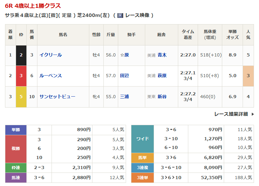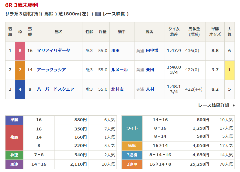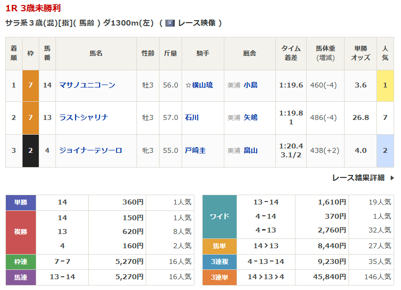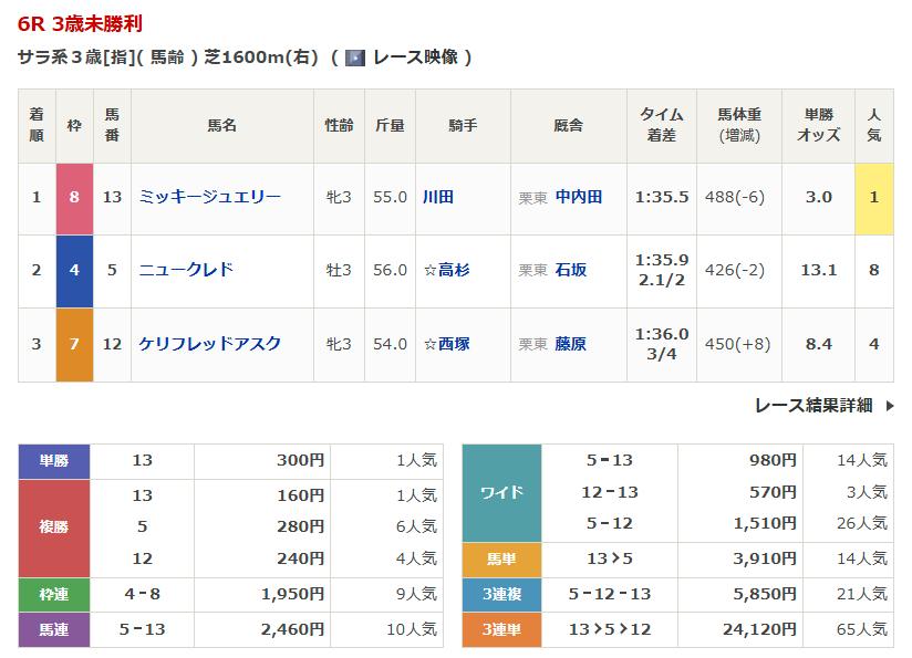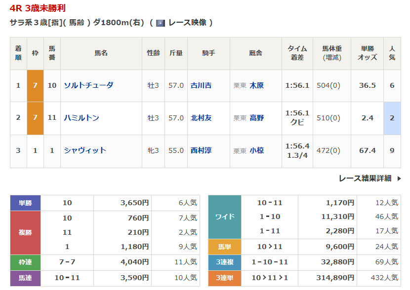 ◎ソルトチューダ(6人気)1着 単勝3,650円、複勝760円