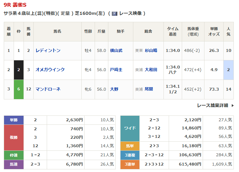 ◎レディントン(10人気)1着 単勝2,630円、複勝740円