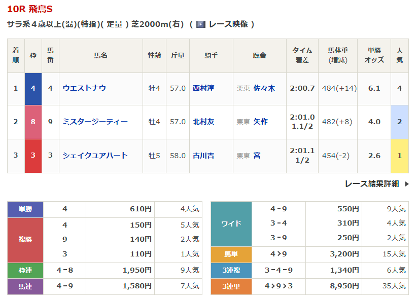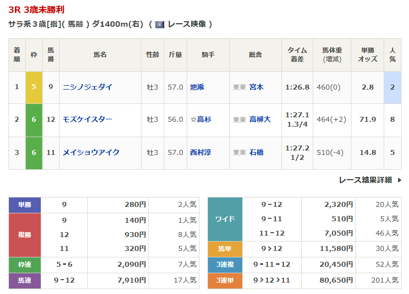 ◎メイショウアゴナス(6人気)2着 複勝260円