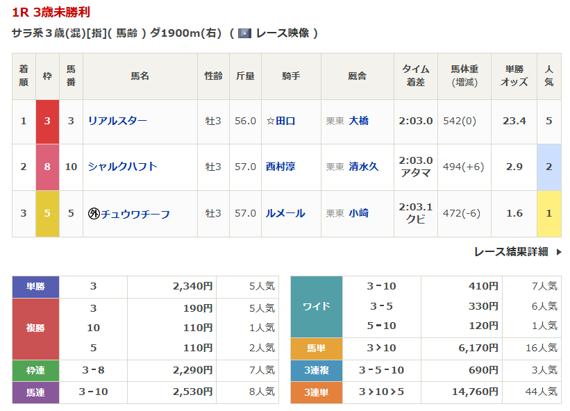 ◎リアルスター(5人気)1着 単勝2,340円、複勝190円