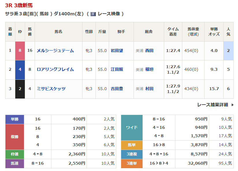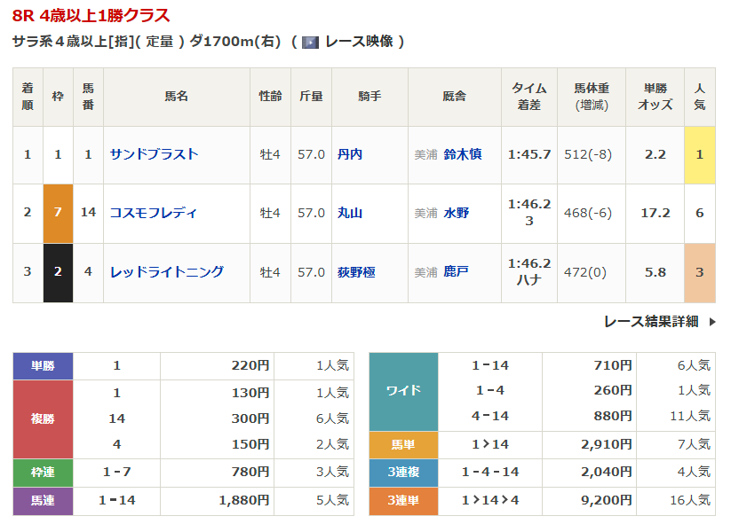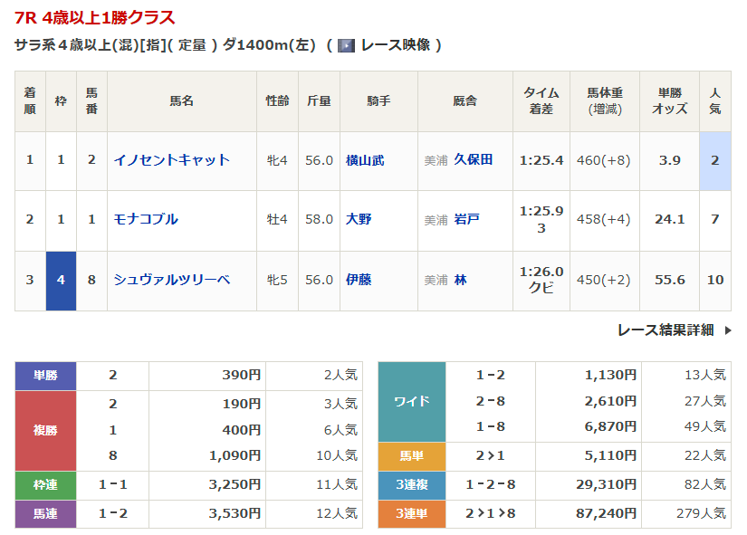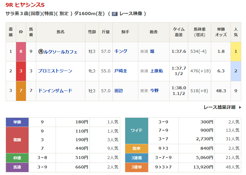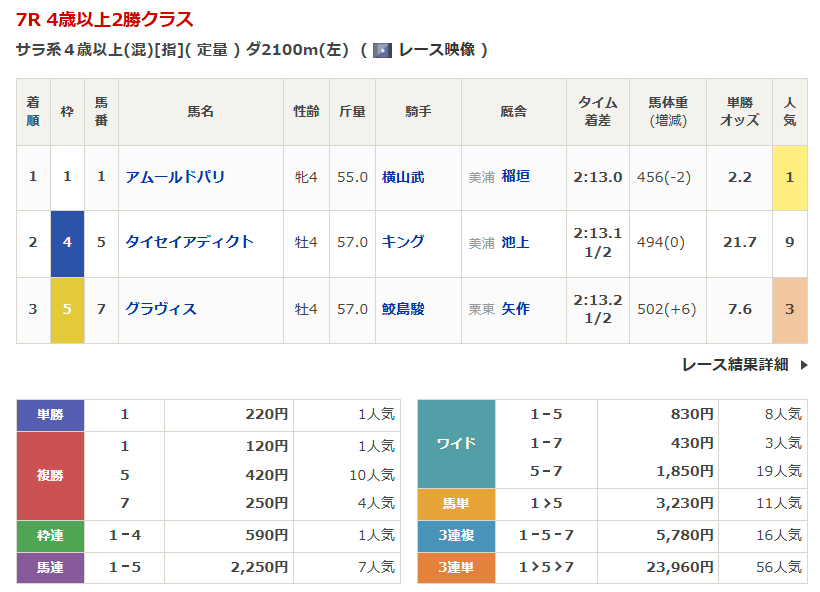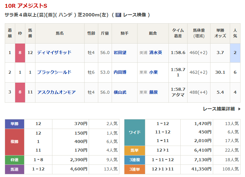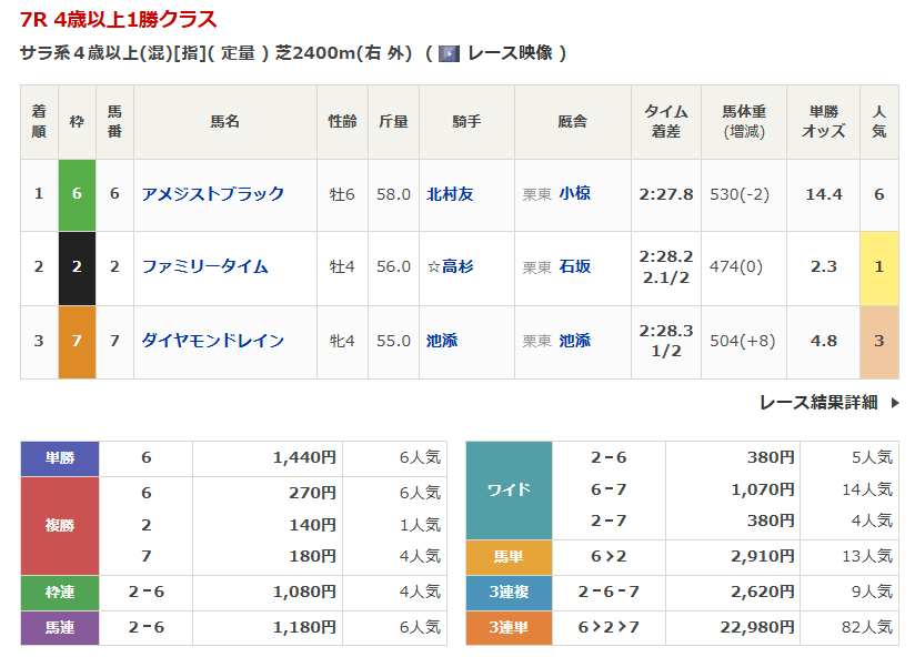 ◎アメジストブラック(6人気)1着 単勝1,440円、複勝270円