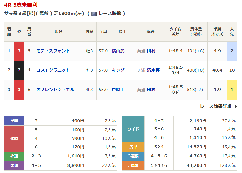 ◎モティスフォント(2人気)1着 単勝490円、複勝160円