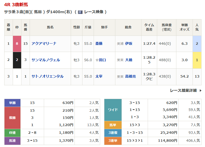 ◎アクアマリーナ(2人気)1着 単勝630円、複勝210円