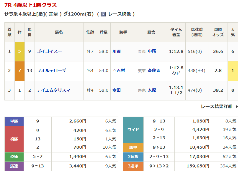 ◎タマモアオゾラ(5人気)2着 複勝240円