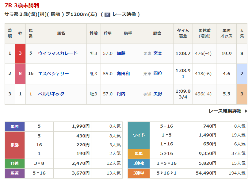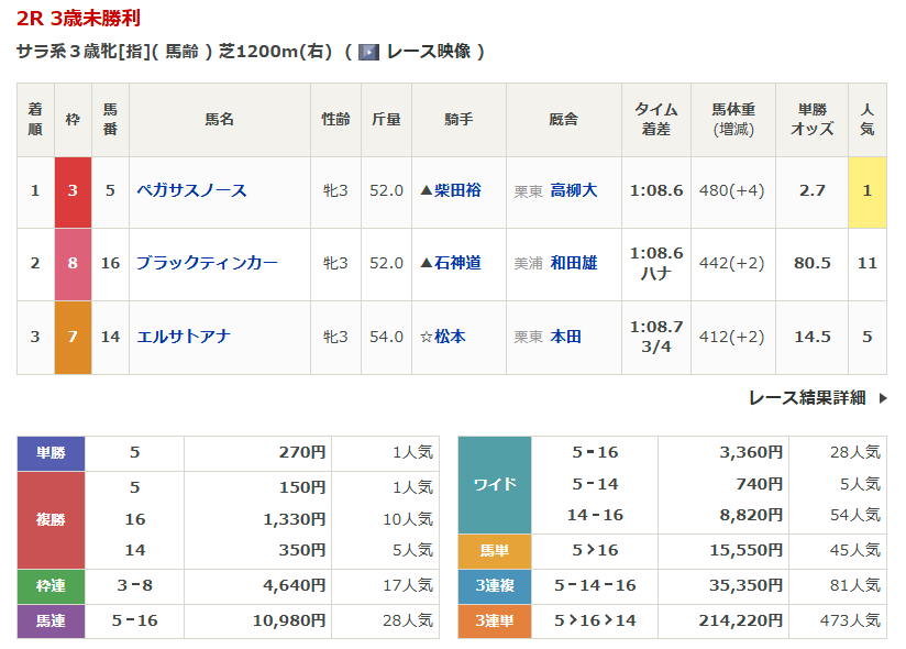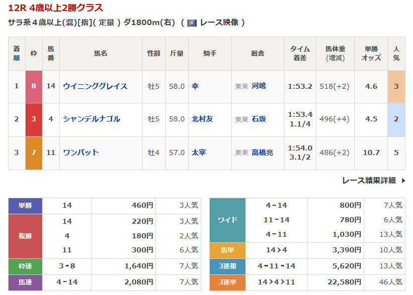 ◎ウイニンググレイス(3人気)1着 単勝460円、複勝220円