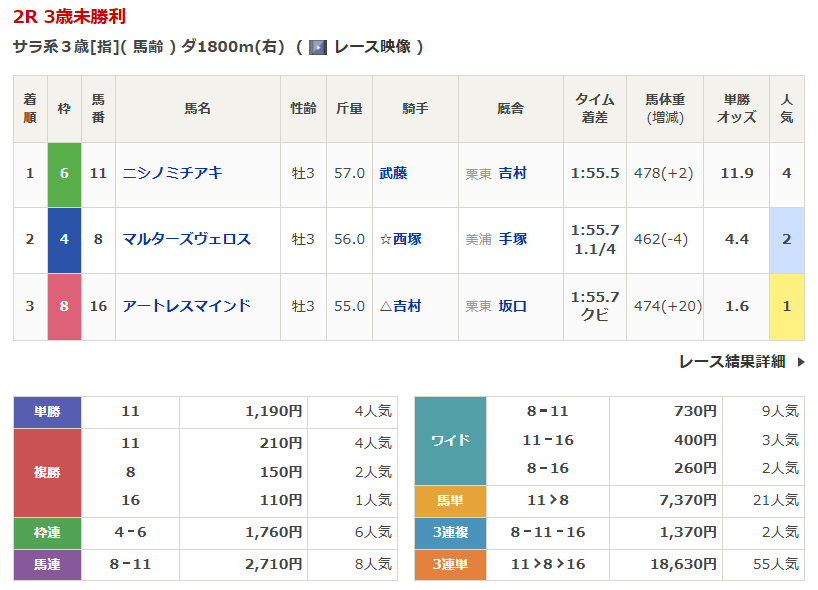 ◎ニシノミチアキ(4人気)1着 単勝1,190円、複勝210円 - 2/23【京都4R】3歳新馬