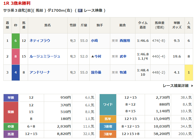 ◎ネティフラウ(6人気)1着 単勝950円、複勝370円