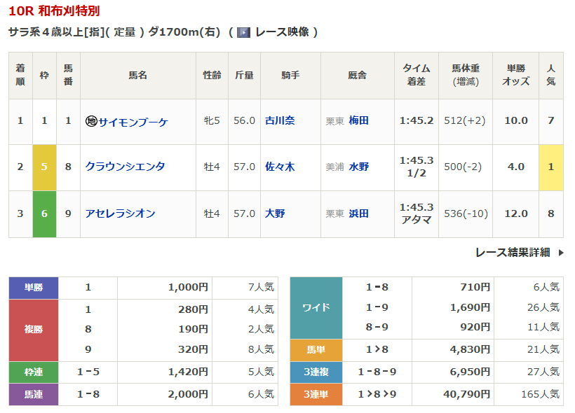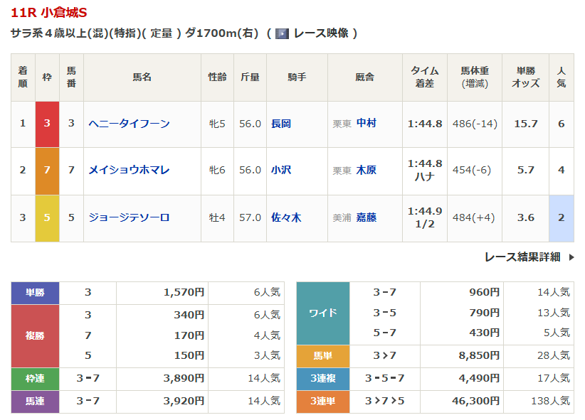 ◎ヘニータイフーン(6人気)1着 単勝1,570円、複勝340円