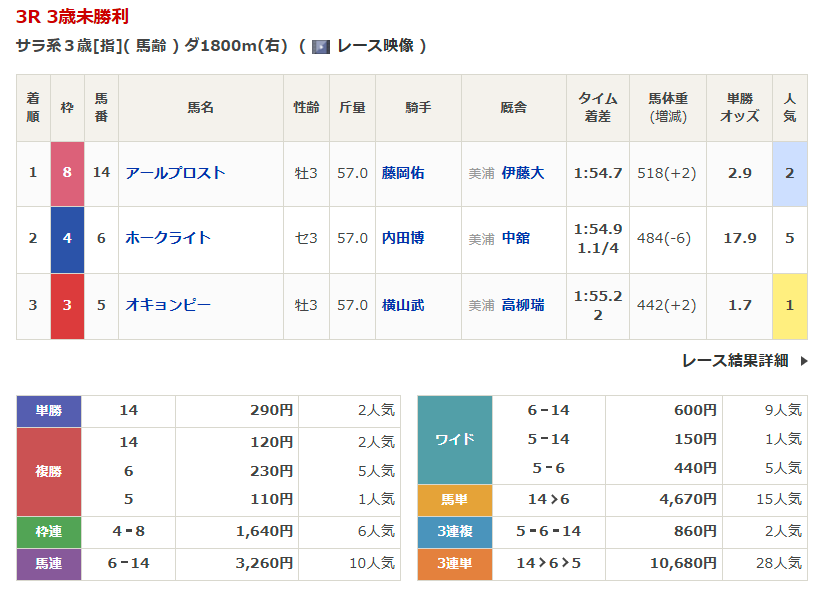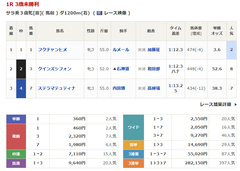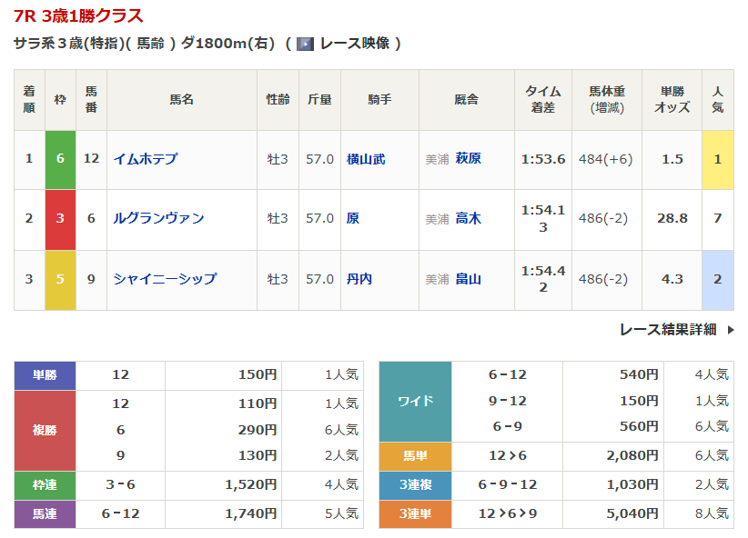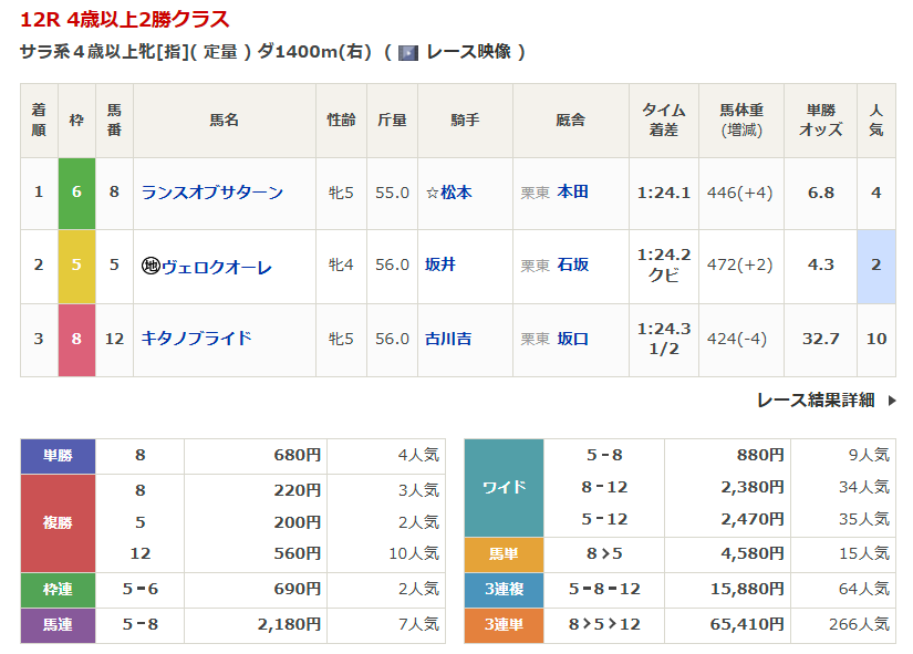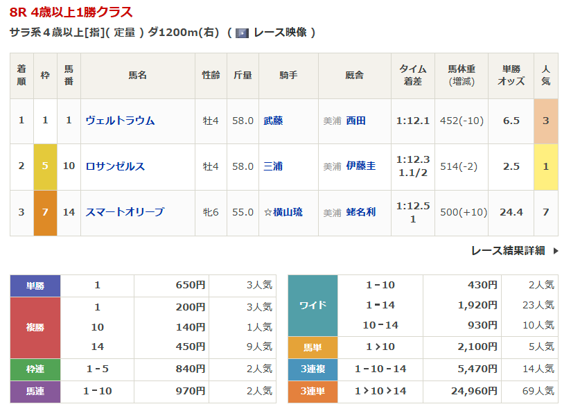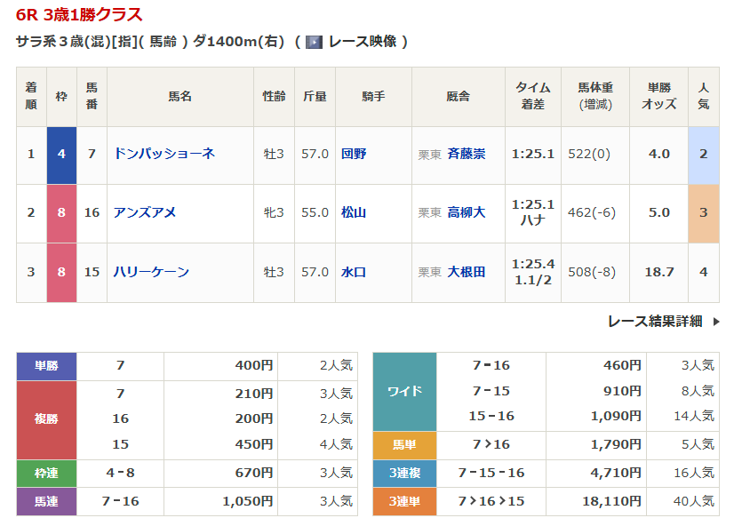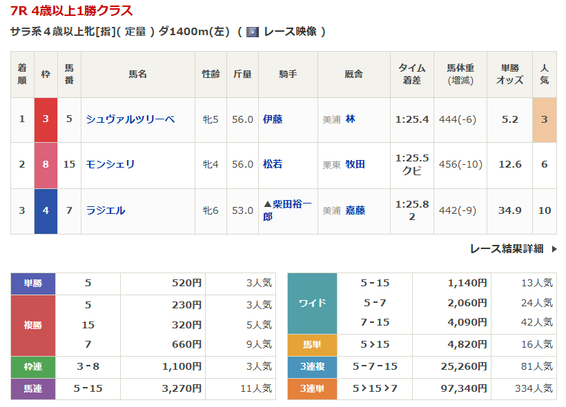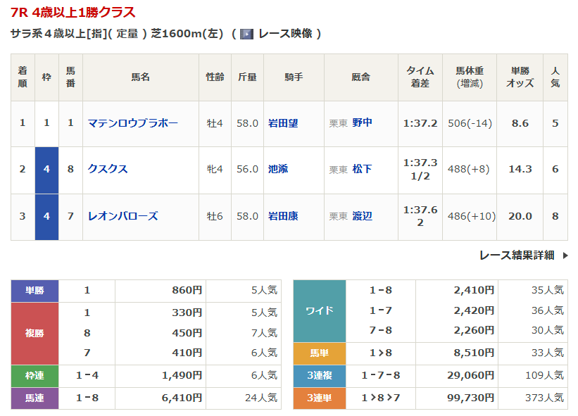 ◎マテンロウブラボー(5人気)1着 単勝860円、複勝330円