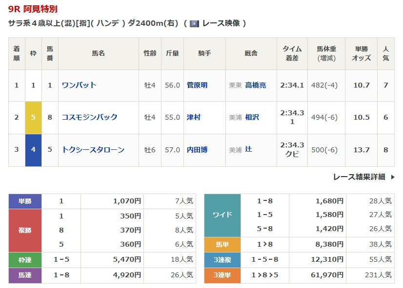 ◎エアロソニック(9人気)1着 単勝2,610円、複勝660円