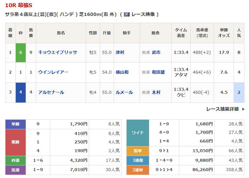 ◎キョウエイブリッサ(8人気)1着 単勝1,790円、複勝410円