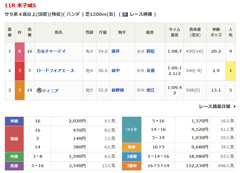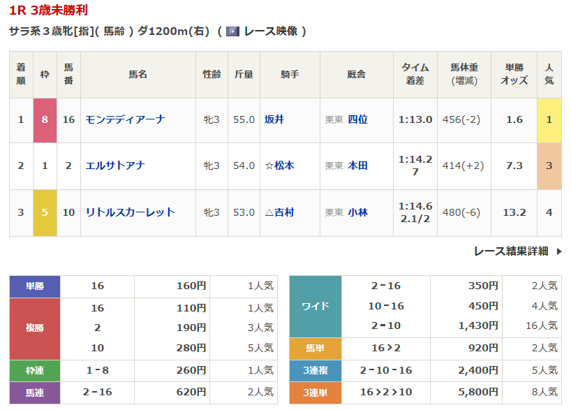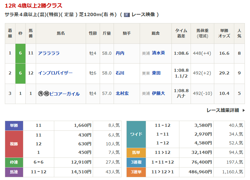 ◎アララララ(8人気)1着 単勝1,660円、複勝430円