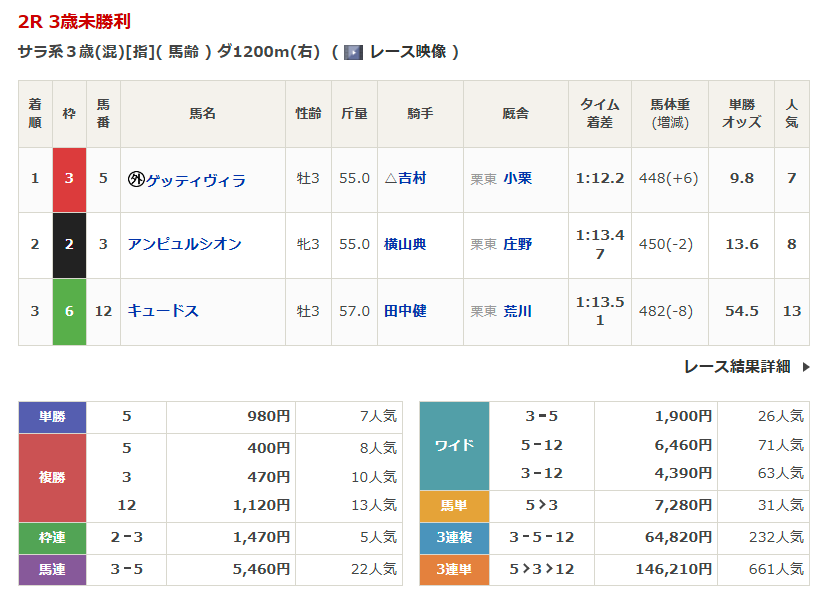 ◎ゲッティヴィラ(7人気)1着 単勝980円、複勝400円